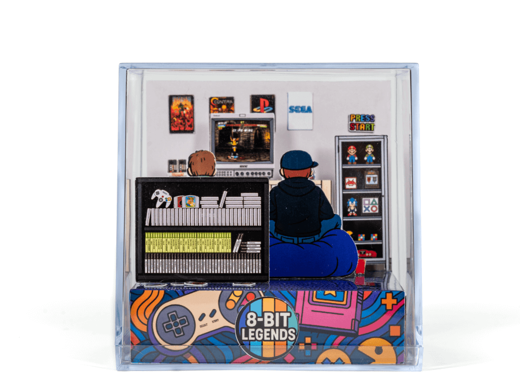 The 8-Bit Legends diorama feels like stepping back into a friend’s room on a Saturday night in the 90s. The shelves are stacked with cartridges, the posters glow with the faces of heroes long past, and the soft buzz of the CRT fills the air. Two gamers sit shoulder to shoulder on the floor, lost in the simple joy of endless levels and shared victories.