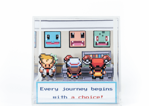 🔥 Pokémon FireRed diorama captures the moment where every great adventure begins. Inside Professor Oak’s lab, a new trainer stands before three Poké Balls, ready to choose their first partner - Charmander, Squirtle, or Bulbasaur. The classic pixel art scene bursts with nostalgia, reminding us of the excitement of our very first Pokémon journey.
