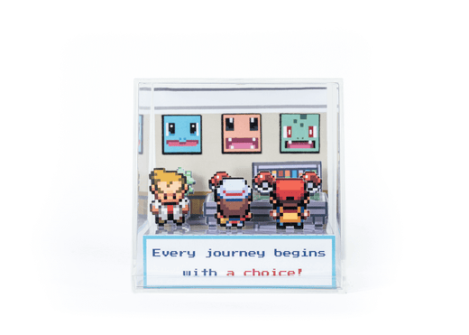 Behind its clear display, Pokémon FireRed diorama preserves the heart of the original adventure. Within this miniature lab, Professor Oak awaits as the young trainer decides which Pokémon will become their lifelong companion. Every detail, from the retro sprites to the dialogue box, rekindles the spirit of discovery that defined a generation of players.